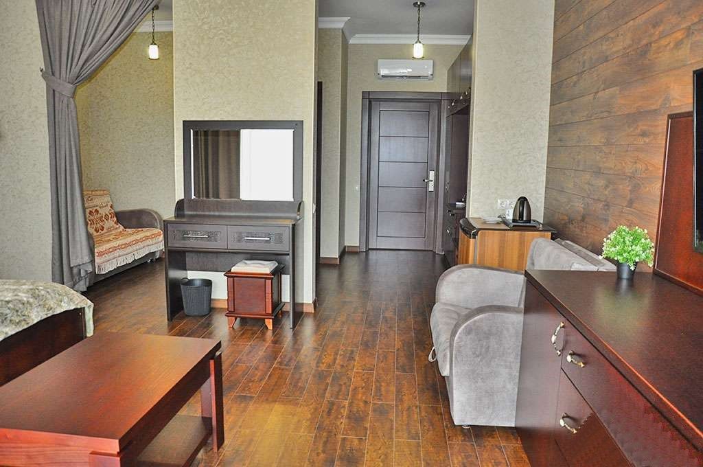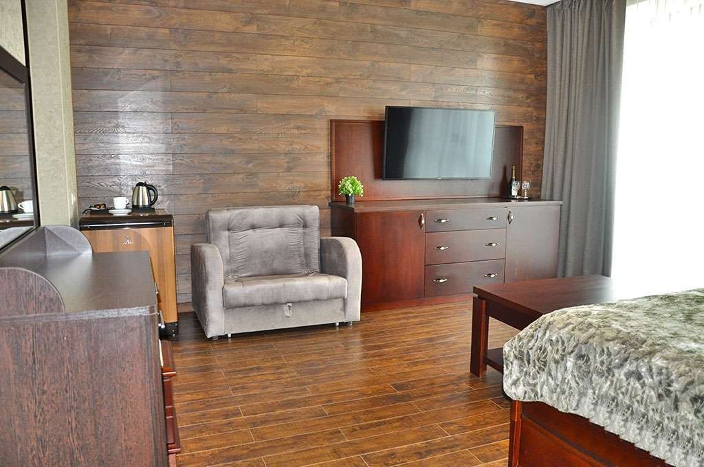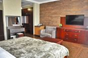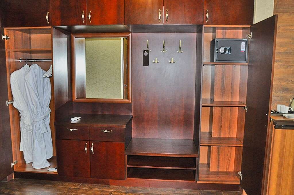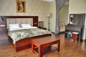 Двуспальная кровать,диван-кровать, кресло-кровать, прикроватные тумбочки, журнальный столик, туалетный столик с зеркалом, пуфик, шкаф с зеркалом, вешалка, халат