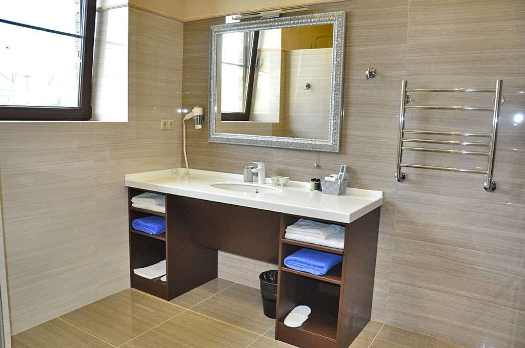 Совмещенный санузел в номере, комплект полотенец,халат, тапочки, фен, биде и туалетные принадлежности
