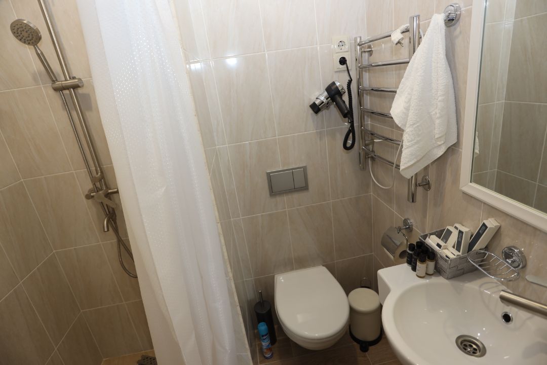 Совмещенный санузел в номере, комплект полотенец,халат, тапочки, фен, туалетные принадлежности