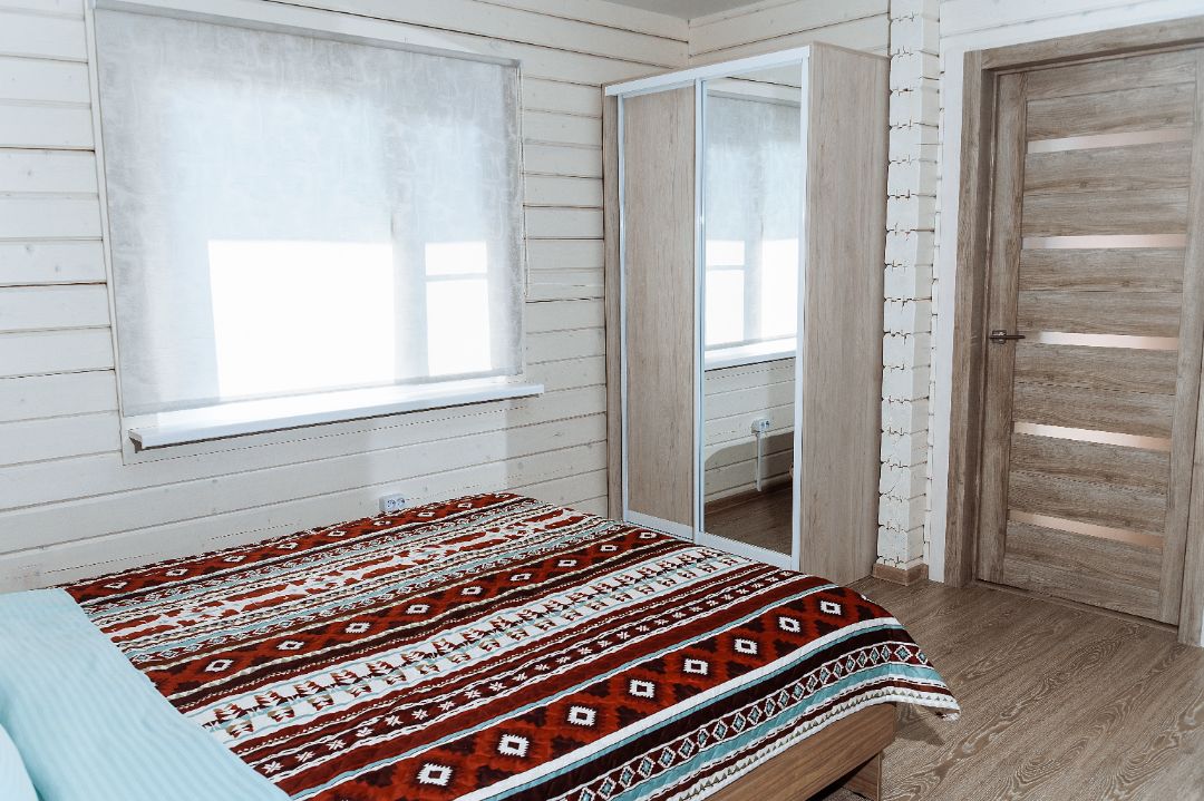 Двуспальная и односпальная кровати, прикроватные тумбочки, гардеробный шкаф с зеркалом,обеденный стол со стульями.